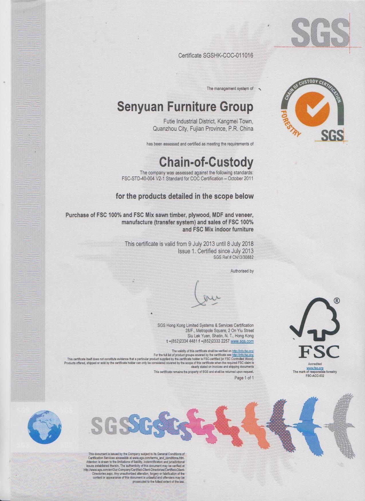 On July 12, 2013, Senyuan received the FSC COC certificate from SGS (Swiss General Public Notary, a well-known international organization engaged in inspection, testing, quality assurance and certification), marking the adoption of FSC COC (Sen products) Certification of Chain of Custody. At the heart of the FSC is sustainable forest management. One of the main objectives of the certification is to reduce deforestation, especially to reduce deforestation. A balance must be struck between deforestation and restoration to ensure that the area of the forest does not decrease or increase while meeting the needs of the wood. The FSC also requires greater efforts to protect the environment from environmental protection.