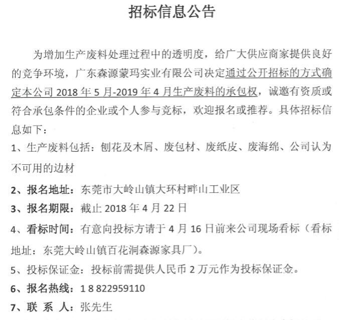 Guangdong Senyuan Mengma Industrial Co., Ltd. Announcement on the tendering of production waste contracting rights from May 20 to April 2019