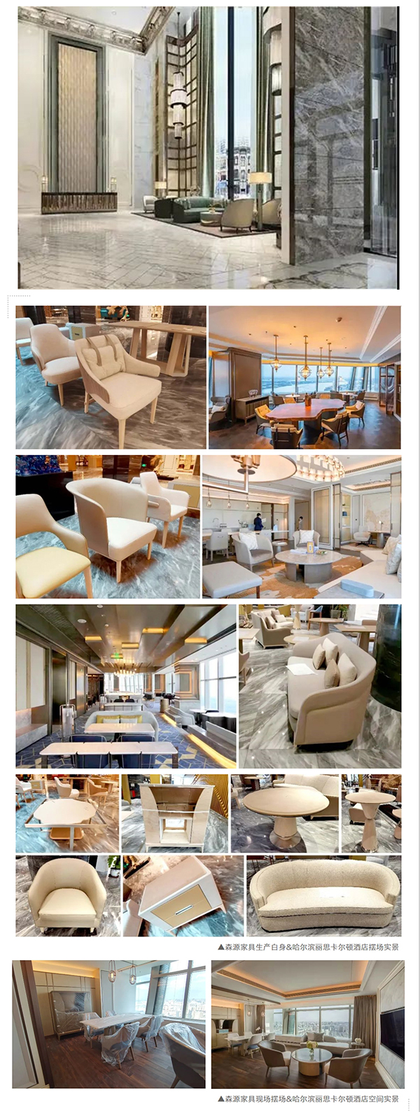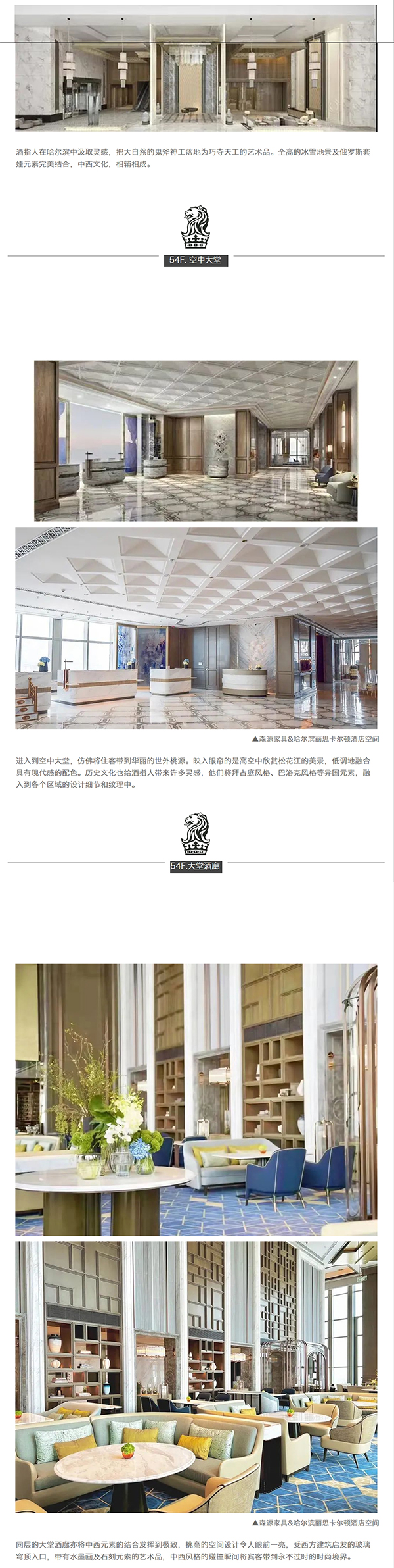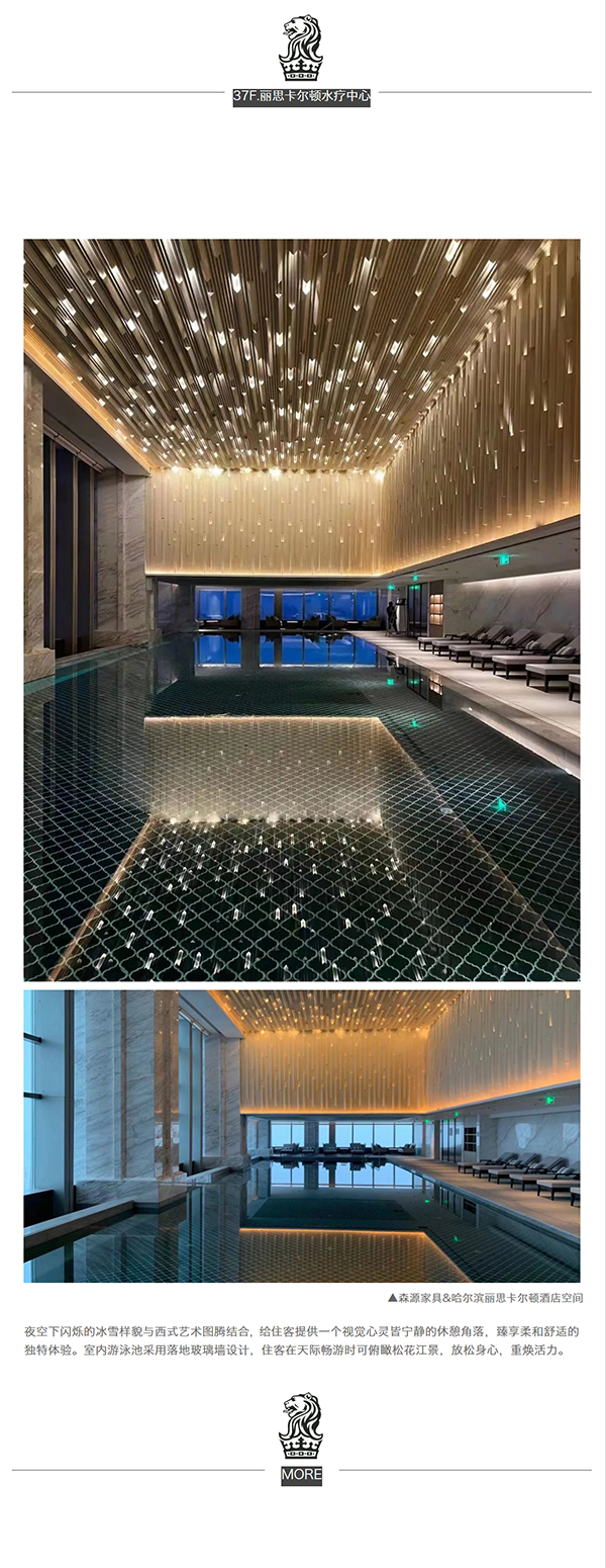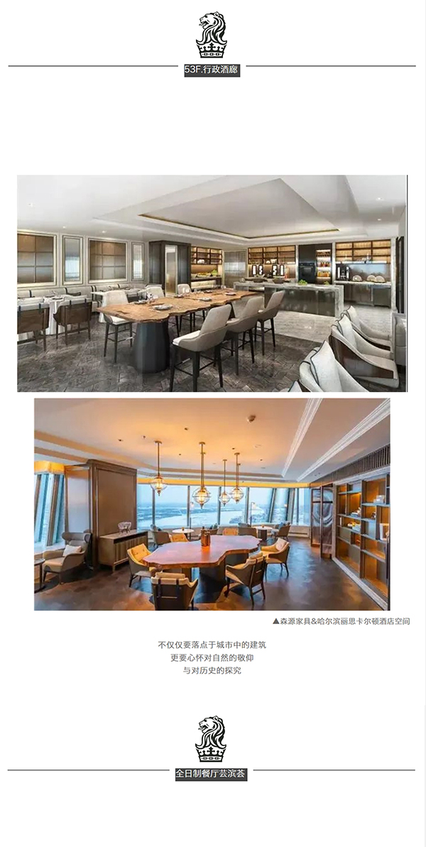 十分感謝富力集團&哈爾濱麗思卡爾頓酒店,森源家具有幸承接了酒店核心版塊:首三層所有公共區域包含到達大堂、所有ES行政套房、五十三層行政酒廊、五十四層空中大堂和空中酒廊區、三十七層泳池及健身房區等**定制家具。