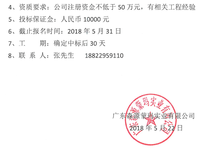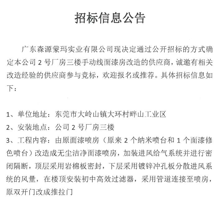 廣東森源蒙瑪實業有限公司現決定通過公開招標的方式確定本公司2號廠房三樓手動線面漆房改造的供應商,誠邀有相關改造經驗的供應商參與競標,歡迎報名或推薦,具體招標信息如下:
