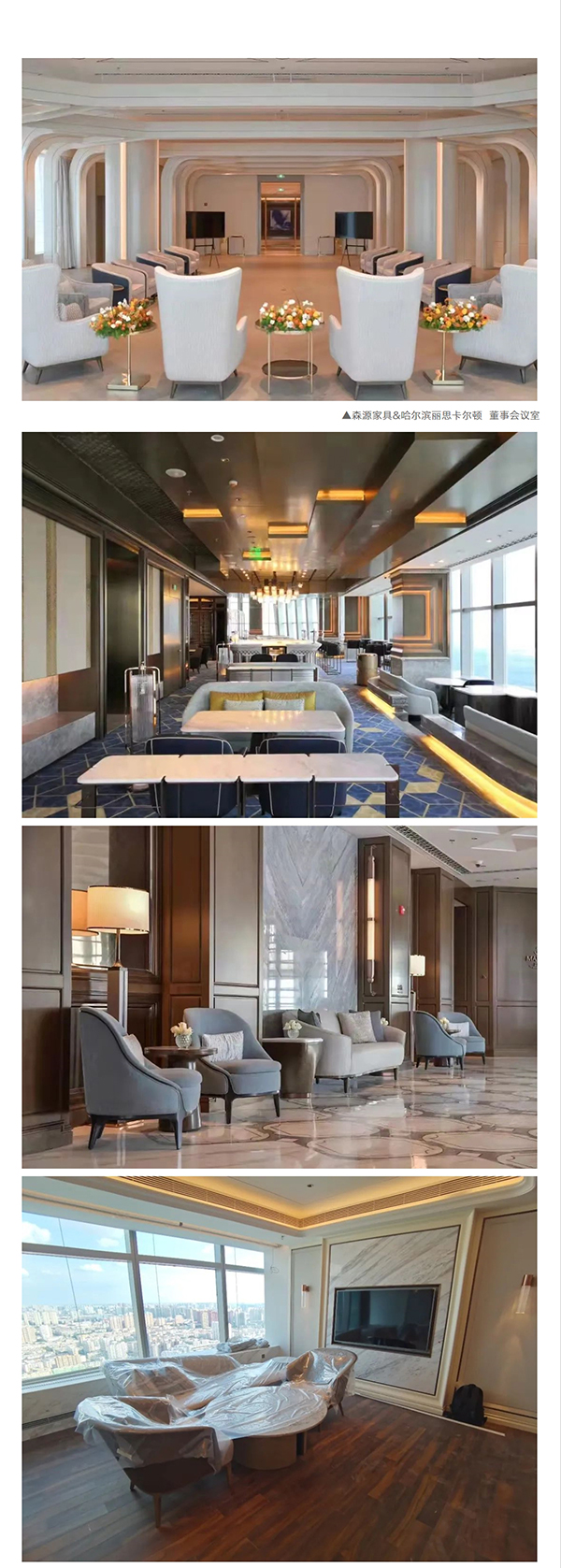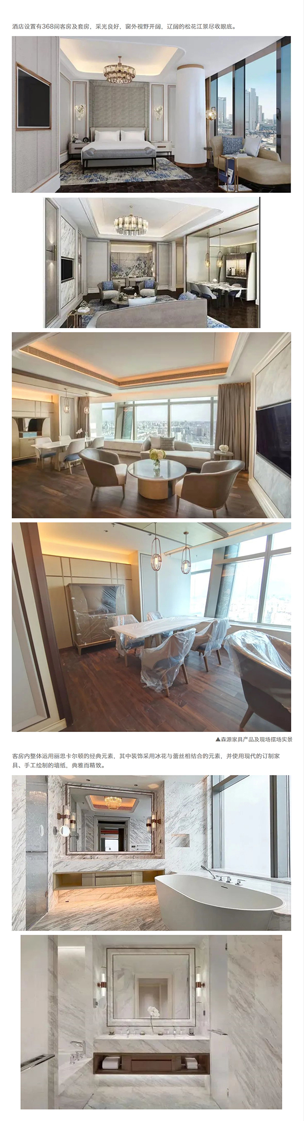 十分感謝富力集團&哈爾濱麗思卡爾頓酒店,森源家具有幸承接了酒店核心版塊:首三層所有公共區域包含到達大堂、所有ES行政套房、五十三層行政酒廊、五十四層空中大堂和空中酒廊區、三十七層泳池及健身房區等**定制家具。