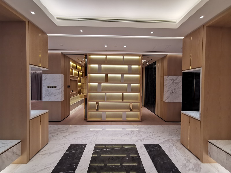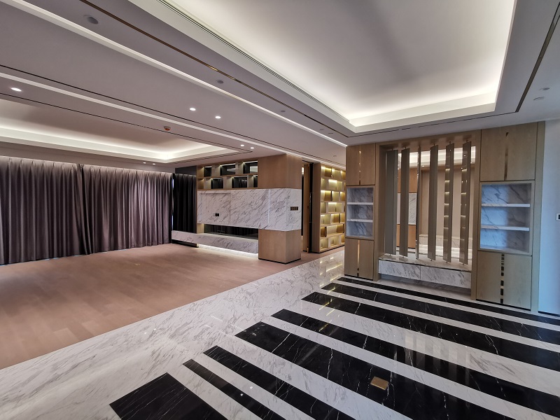 逾12.5米挑高的入戶大堂,總面積1200㎡,大膽的采用了東方白大理石、勞倫斯黑金大理石等罕見的高級石材,猶如藝術品一樣的設計,傳達出一種尊貴及永恒流傳的經典。同時營造出殿堂級的莊嚴肅靜感,可以稱為深圳乃至全國的標桿范本。