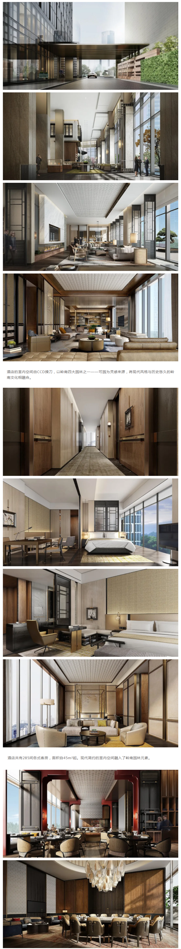 酒店的室內空間由CCD操刀,以嶺南四大園林之一——可園為靈感來源,將現代風格與歷史悠久的嶺南文化相融合。